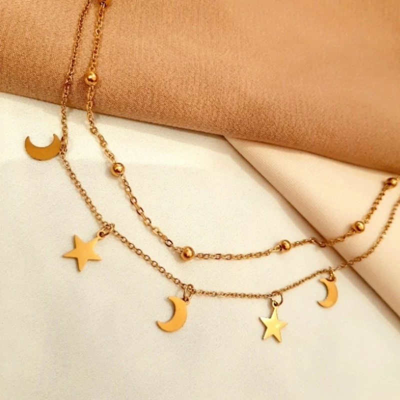 گردنبند دخترانه دولاین آویزدار ستاره و ماه و زنجیر توپی استیل و رنگ ثابت