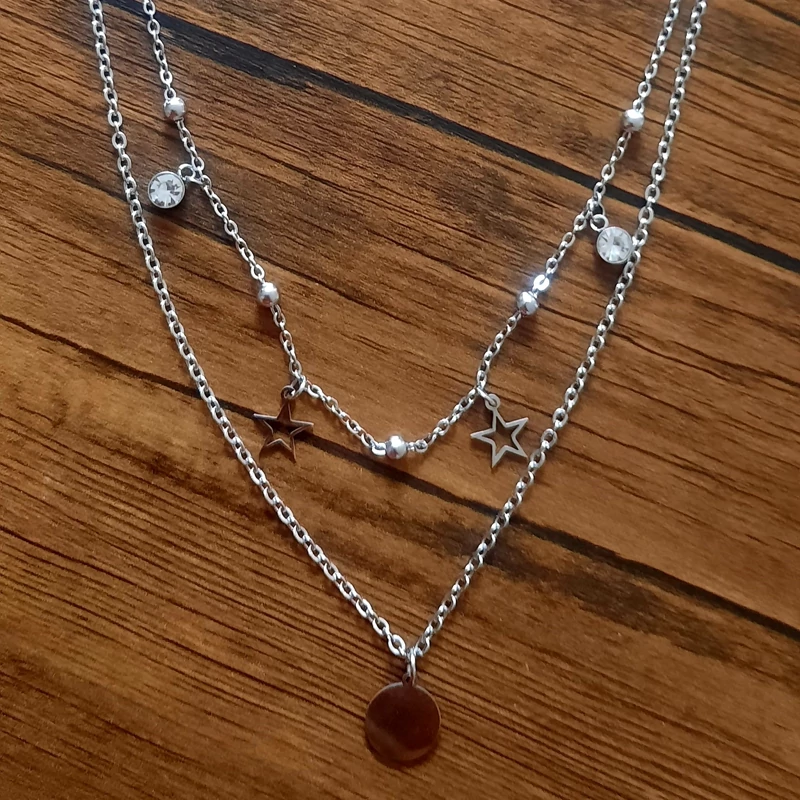 گردنبند زنانه دو لاین توپی با آویز نگین و ستاره استیل در دورنگ طلایی و نقره ای