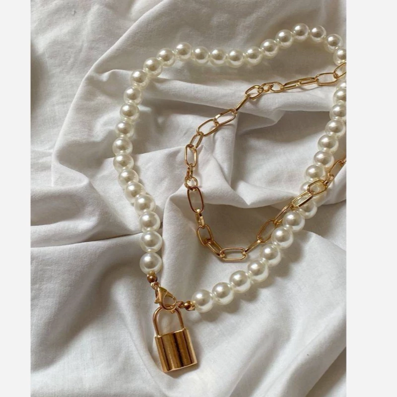گردنبند زنانه دولاین مرواریدی با آویز قفل طلایی