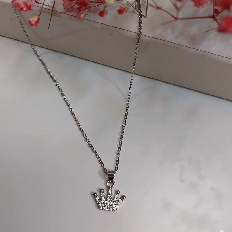 گردنبند دخترانه مدل تاج نقره ای با زنجیر آبکاری نقره 47سانت
