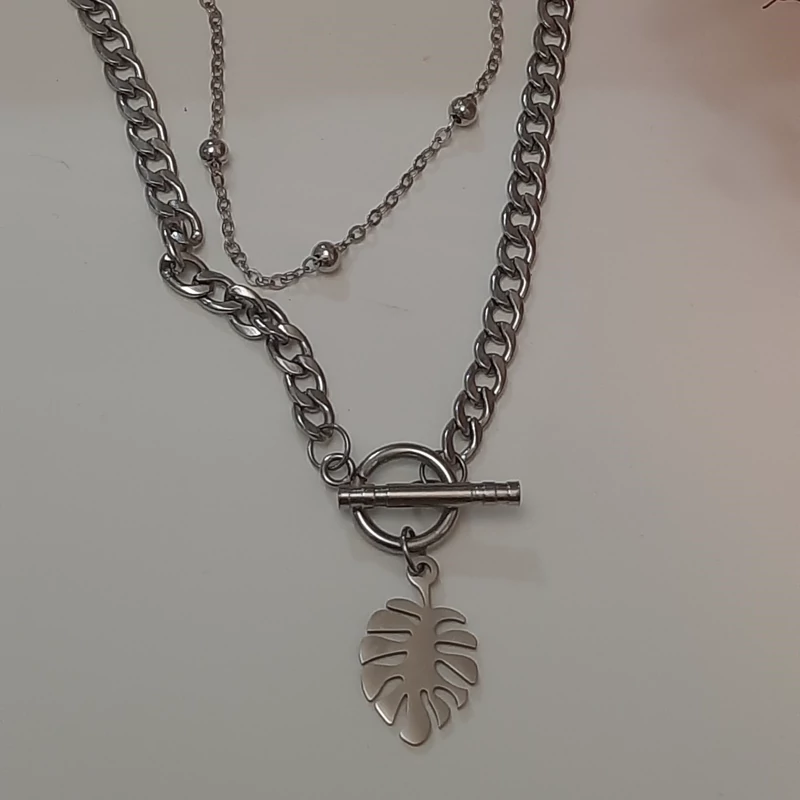 گردنبند زنانه دولاین نقره ای استیل با آویز برگ انجیری
