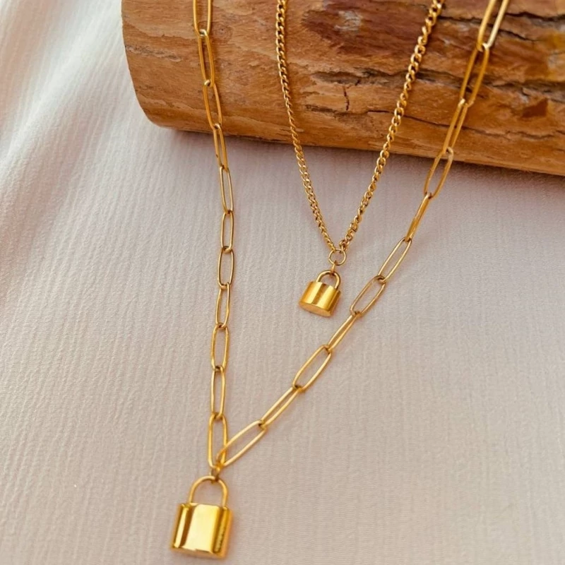 گردنبند دو رج با آویز قفل تیفانی طلایی استیل رنگ ثابت و ضدحساسیت