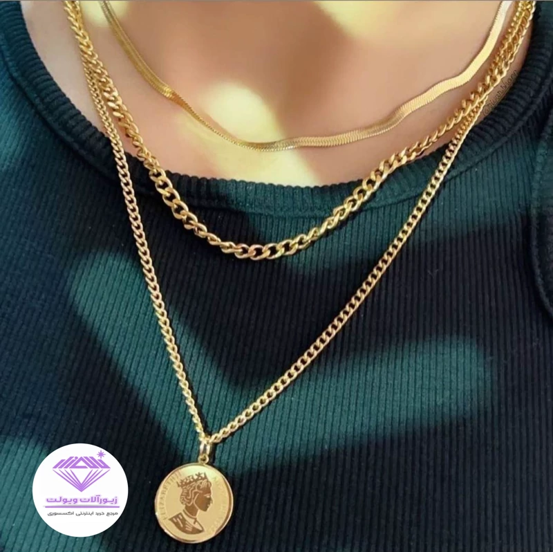 گردنبند زنانه سه رج پولکی آویز سکه ای استیل رنگ ثابت