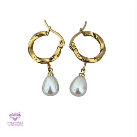 گوشواره آویزی زنانه مدل تیغ ماهی مرواریدی طلایی با قلاب حلقه ای