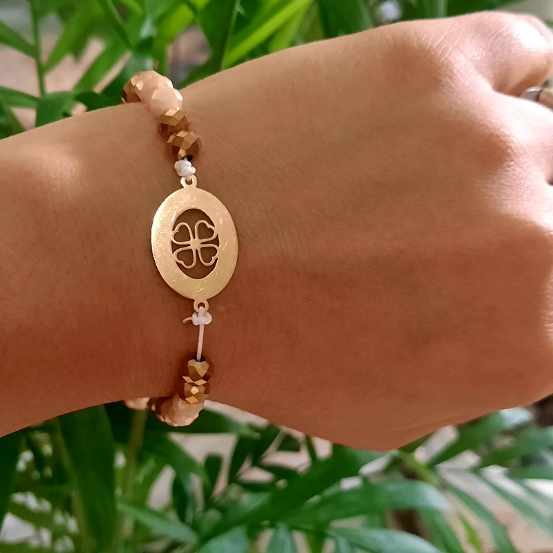 دستبند کریستالی طلایی با پلاک استیل فری سایز گره ای