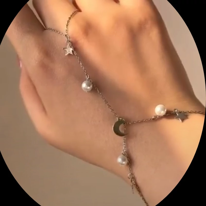 دستبند رودستی تمیمه آویز دار ماه و ستاره و مروارید رنگ ثابت استیل طلایی