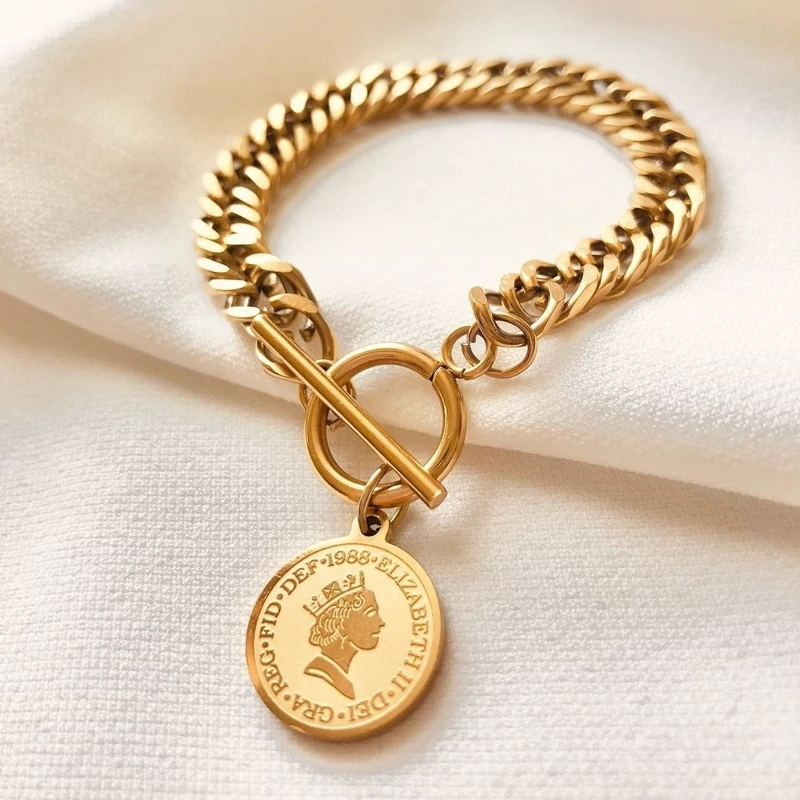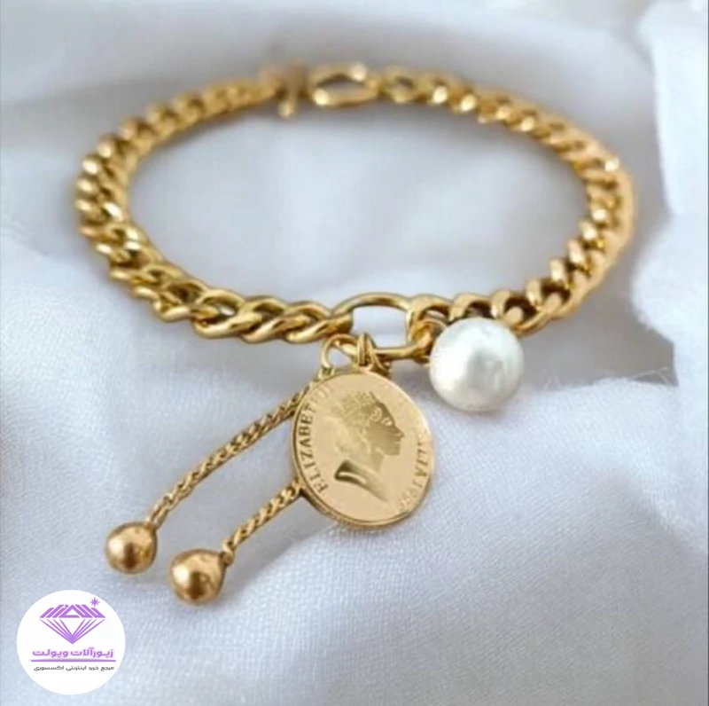 دستبند وارتید زنجیری با آویز سکه الیزابت دخترونه استیل قفل تی