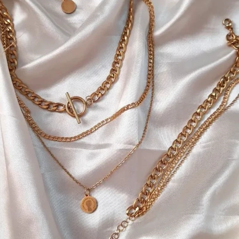 نیم ست زنانه 3 لاین کارتیر سکه ای استیل طلایی گردنبند و دستبند