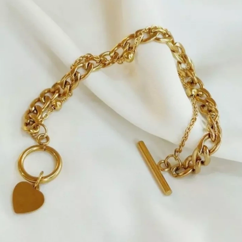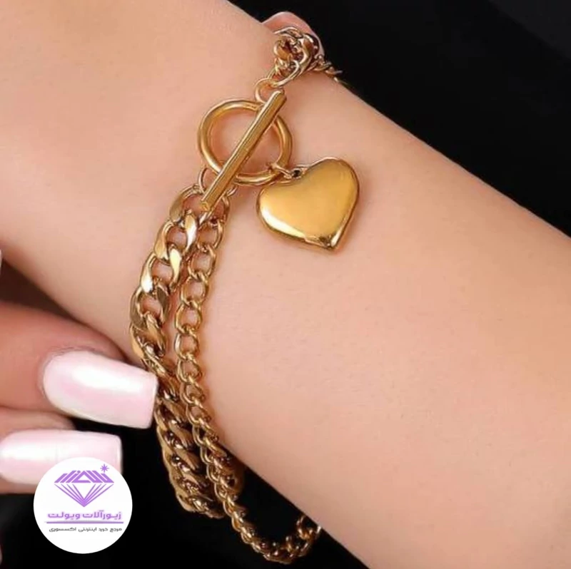 ناموجوددستبند 2لاین زنجیری با آویز قلبی دخترونه استیل قفل تی