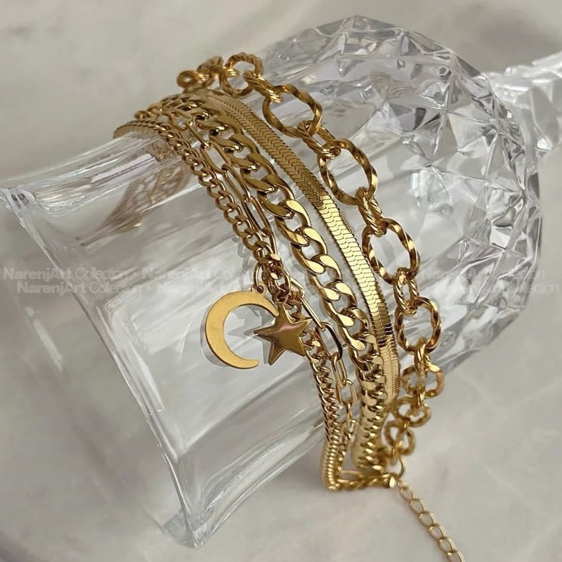 دستبند زنجیری زنانه مدل آویز دار استیل طلایی رنگ ثابت