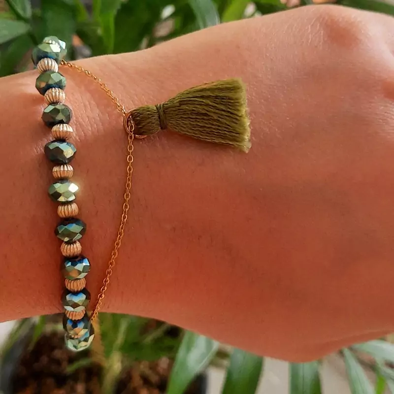 دستبند کریستالی طلایی با پلاک استیل فری سایز گره ای