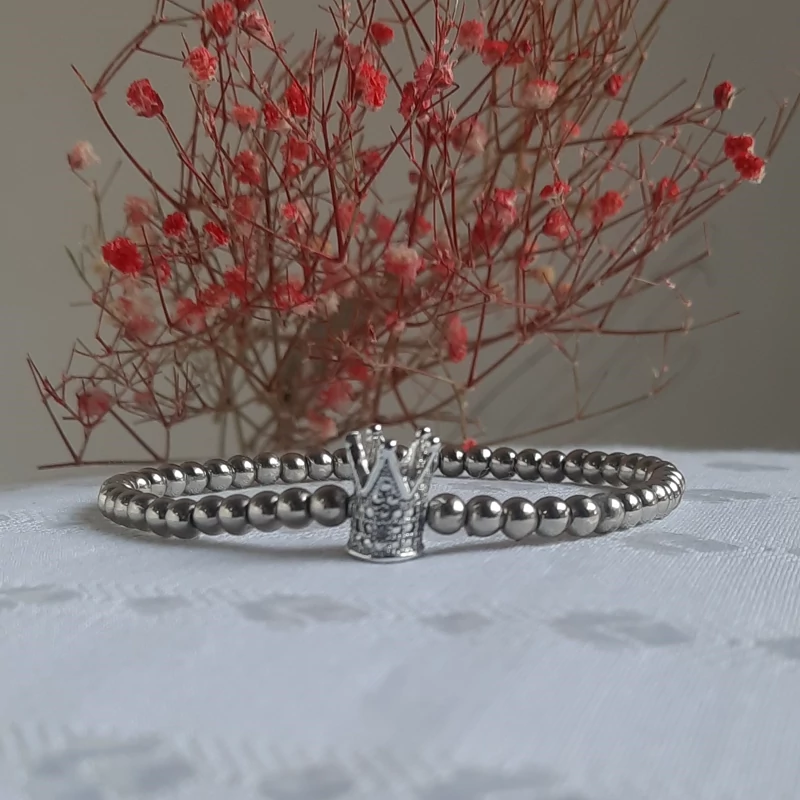دستبند سنگ حدید نقره ای با پلاک تاج استیل پسرانه