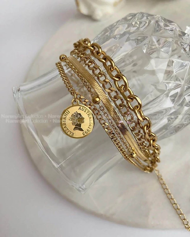 دستبند 4لاین زنجیری با آویز سکه الیزابت زنانه استیل