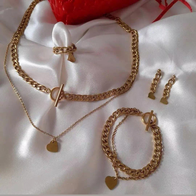ست کامل کارتیر استیل شامل گردنبند و دستبند و گوشواره و انگشتر با اویز قلب طلایی استیل رنگ ثابت محصولی چشم گیر و مشابه طلا و بسیار باکیفیت *سایز دستبند و انگشتر را به صورت سانتی متر در توضیحات شرح دهید*