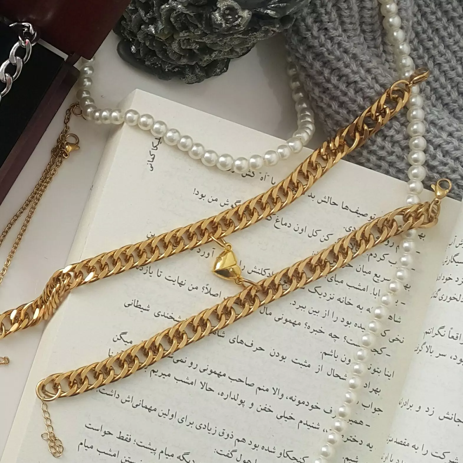 دستبند کارتیر دوبل استیل رنگ ثابت که با قفل مگنتی قلبی شکل بهم وصل میشن و کاری فوق العاده عاشقانه و زیبا هستش
