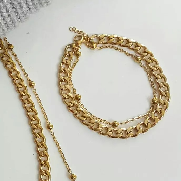 گردنبند دو ردیفه به همراه دستبند دو ردیفه کارتیر و زنجیر توپی استیل رنگ ثابت وصلن به همدیگه