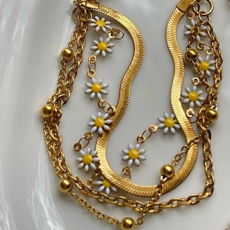 دستبند 4 لاین بابونه ، ماری ، توپی طلایی استیل زنانه دخترانه
