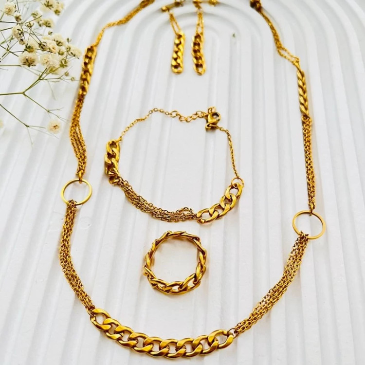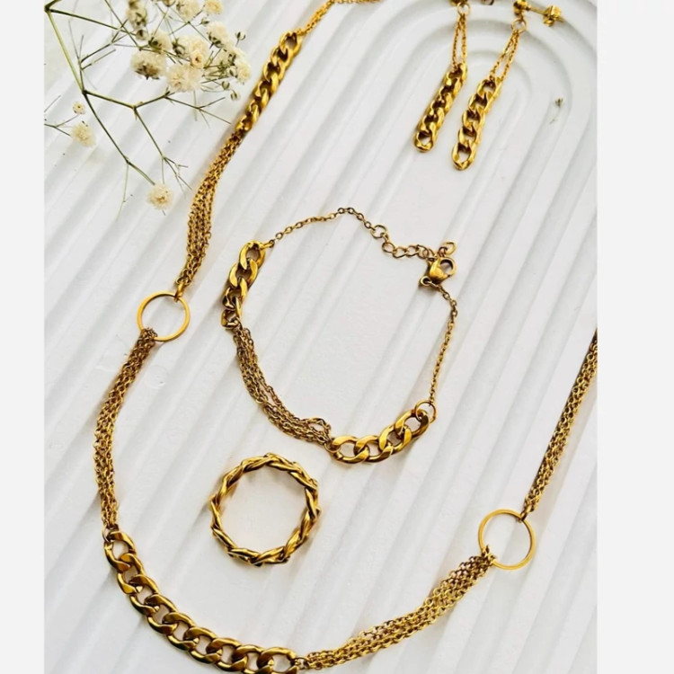 ست زنانه دستساز گردنبند گوشواره دستبند و انگشتر کارتیر جنس استیل رنگ ثابت