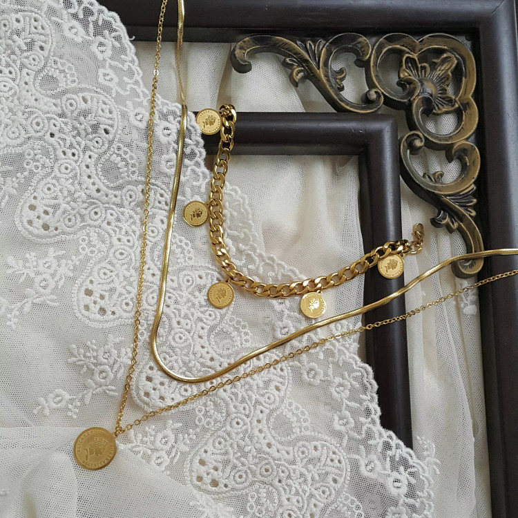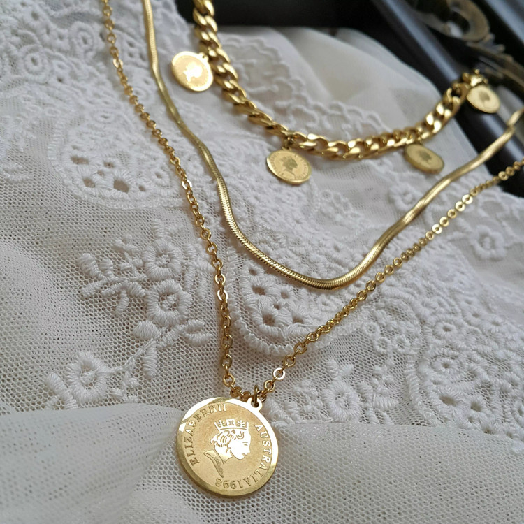گردنبند اول 42سانت با سه سکه الیزابت سایز متوسط و گردنبند دوم ماری 45 سانتی و گردنبند سوم دیپلمات با سکه الیزابت بزرگ 50 سانتی