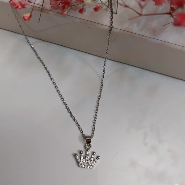گردنبند دخترانه مدل تاج نقره ای با زنجیر آبکاری نقره 47سانت