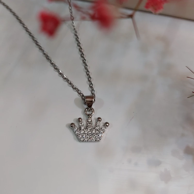 گردنبند دخترانه مدل تاج نقره ای با زنجیر آبکاری نقره 47سانت
