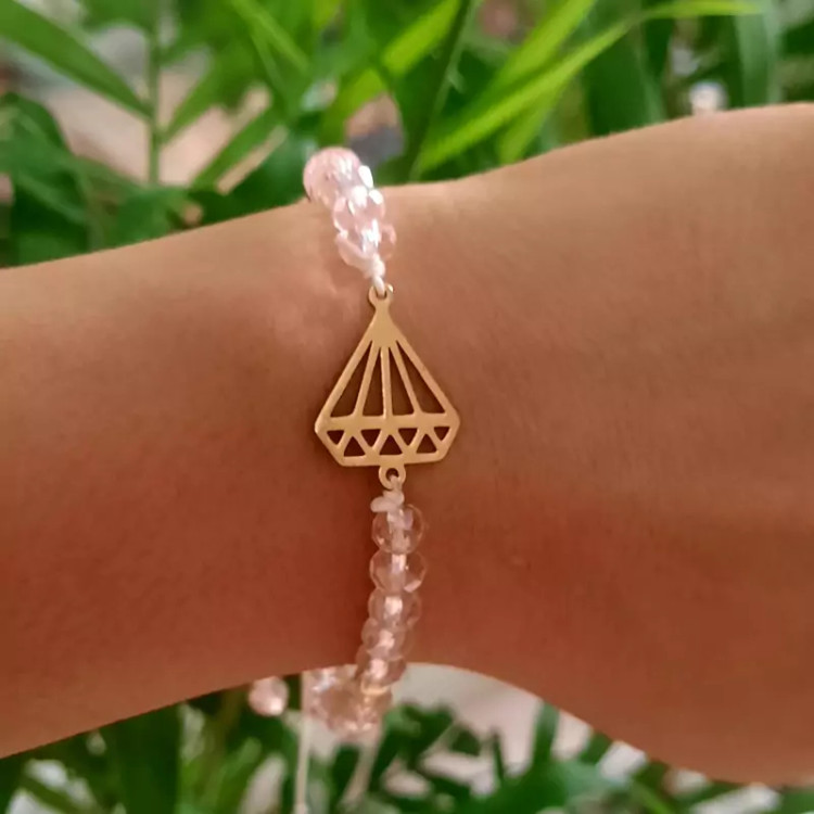 دستبند کریستالی صورتی با پلاک طرح الماس استیل فری سایز گره ای