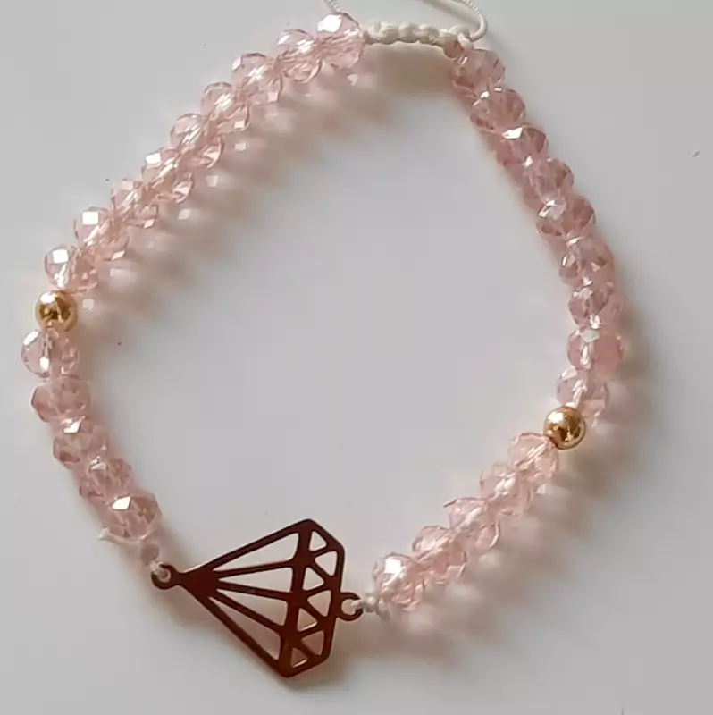 دستبند کریستالی صورتی با پلاک طرح الماس استیل فری سایز گره ای