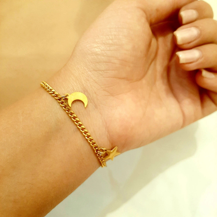 دستبند آویز دار ماه و ستاره با زنجیر کارتیر خیلی ظریف جنس کار تمام استیل با ضمانت رنگ و کیفیت دستساز سایز و اندازه ی کار طبق سلیقه مشتری امکان تغییر مدل طبق سلیقه مشتری امکان ساخت و سفارش گردنبند و گوشواره و انگشتر ست و سفارش سرویس کامل برا راهنمایی بیشتر پیام بدین در خدمتم🌹