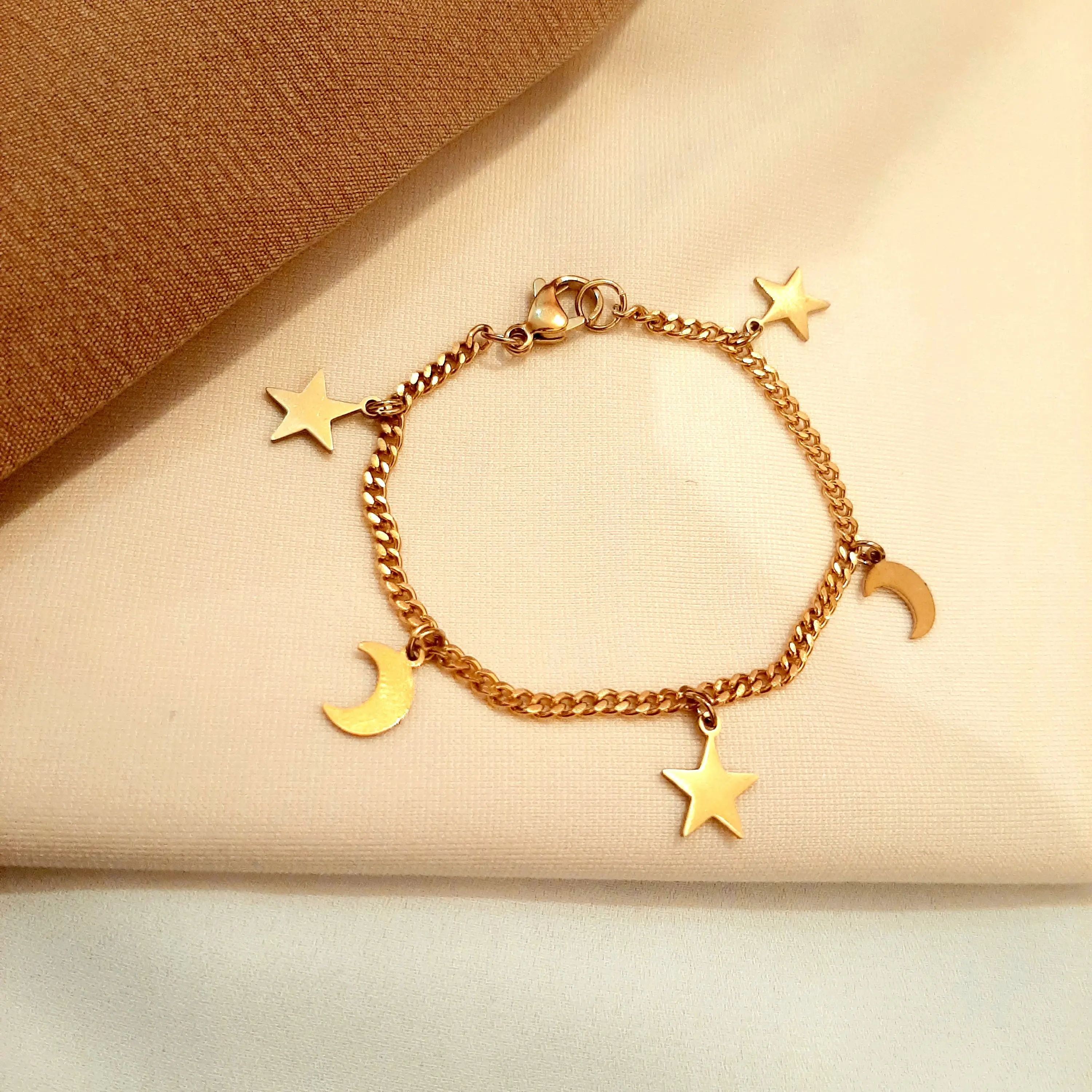 دستبند آویز دار ماه و ستاره با زنجیر کارتیر خیلی ظریف جنس کار تمام استیل با ضمانت رنگ و کیفیت دستساز سایز و اندازه ی کار طبق سلیقه مشتری امکان تغییر مدل طبق سلیقه مشتری امکان ساخت و سفارش گردنبند و گوشواره و انگشتر ست و سفارش سرویس کامل برا راهنمایی بیشتر پیام بدین در خدمتم🌹
