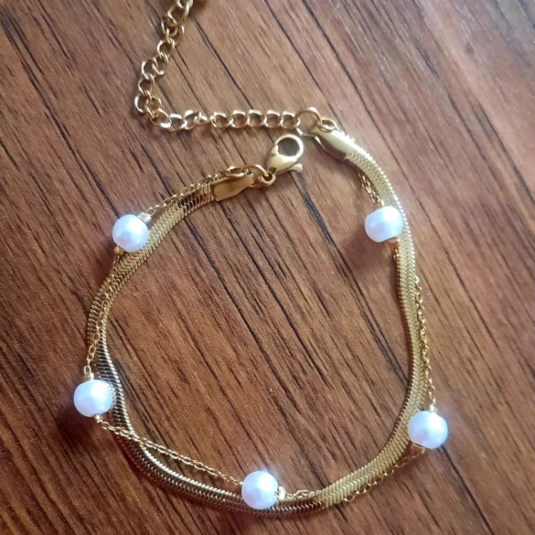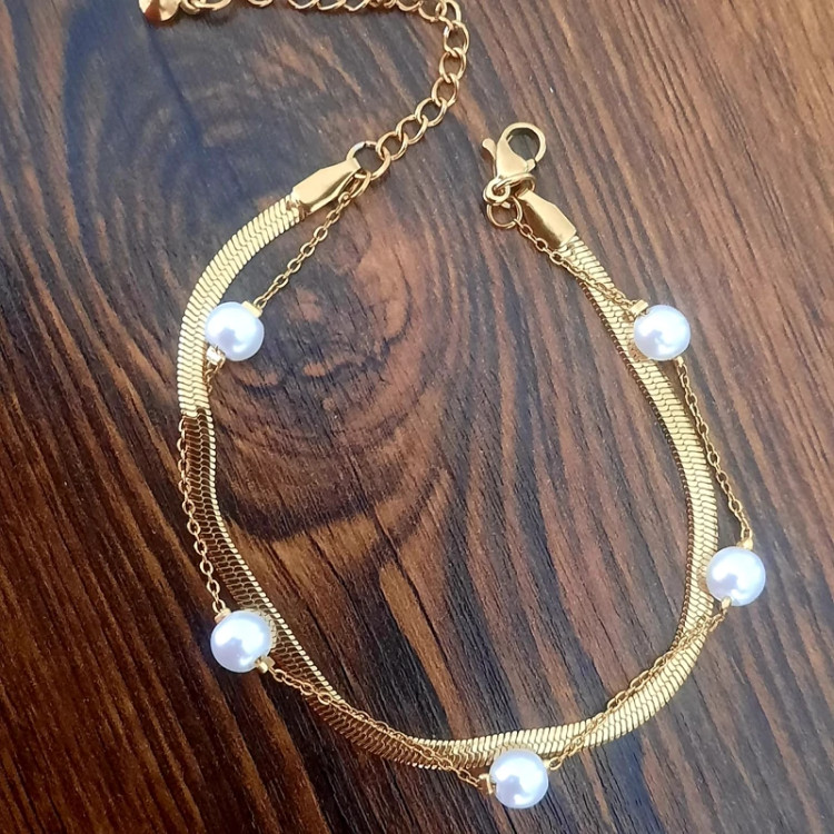 دستبند دولاین ماری آینه ای و مرواریدی طلایی و نقره ای استیل ضدحساسیت
