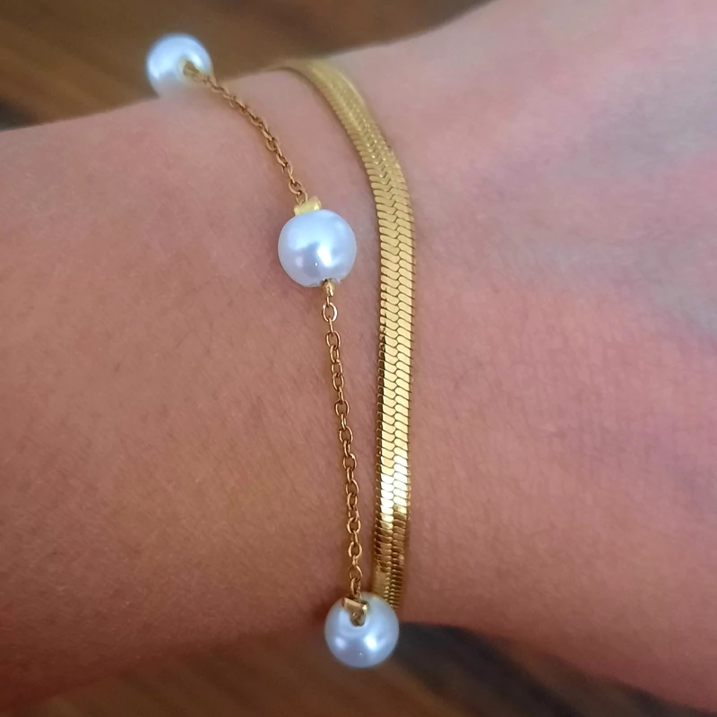 دستبند دولاین ماری آینه ای و مرواریدی طلایی و نقره ای استیل ضدحساسیت