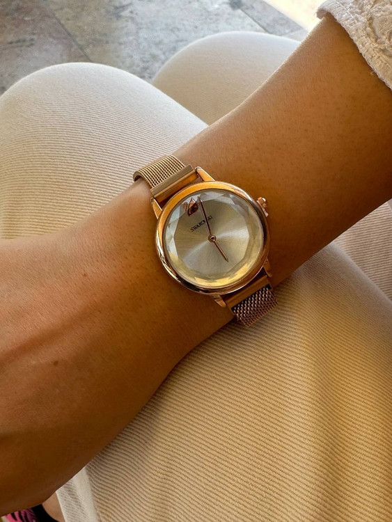 ساعت مچی زنانه برند سواروسکی طرح شیشه الماس جنس استیل موتور ژاپن رنگ رزگلد قفل مگنتی