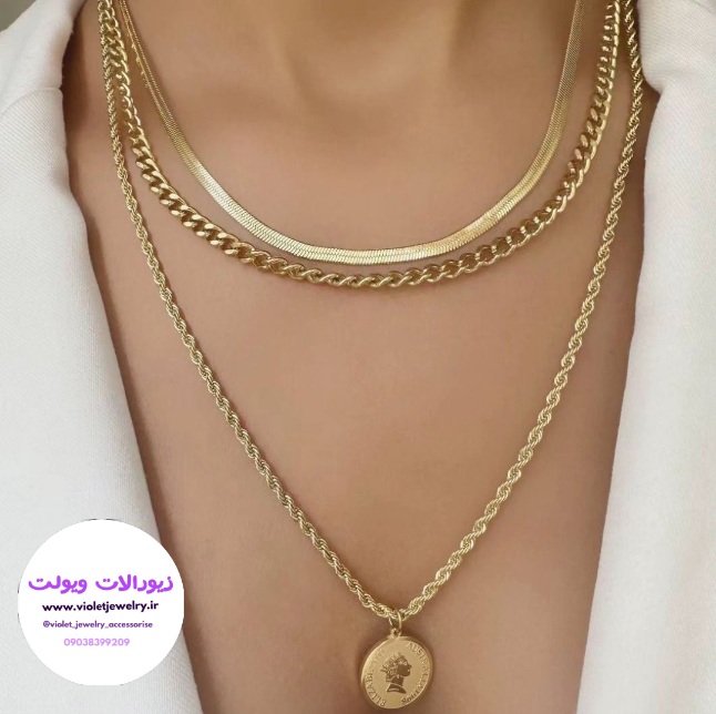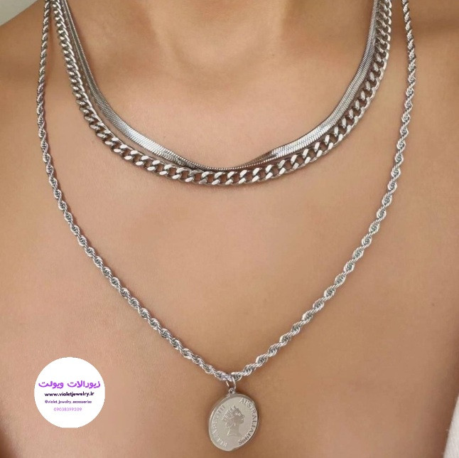 گردنبند ترکیبی کارتیر و زنجیر ماری و زنجیر پیچ با آویز الیزابت جنس استیل طول زنجیر کارتیر ۵۰ سانتیمتر طول زنجیر پیچ ۶۰ سانتیمتر طول زنجیر ماری ۵۰ سانتیمتر میباشد